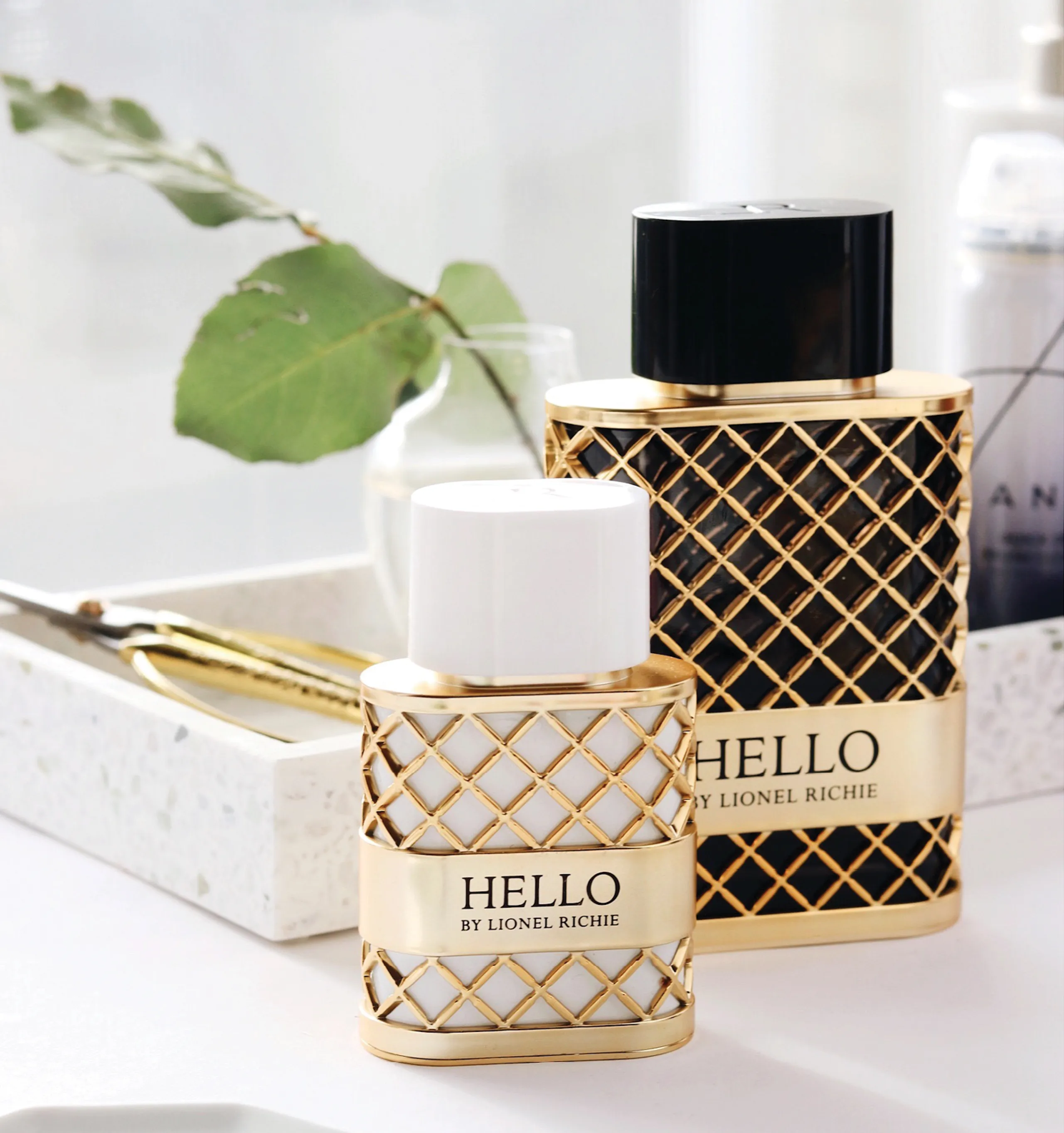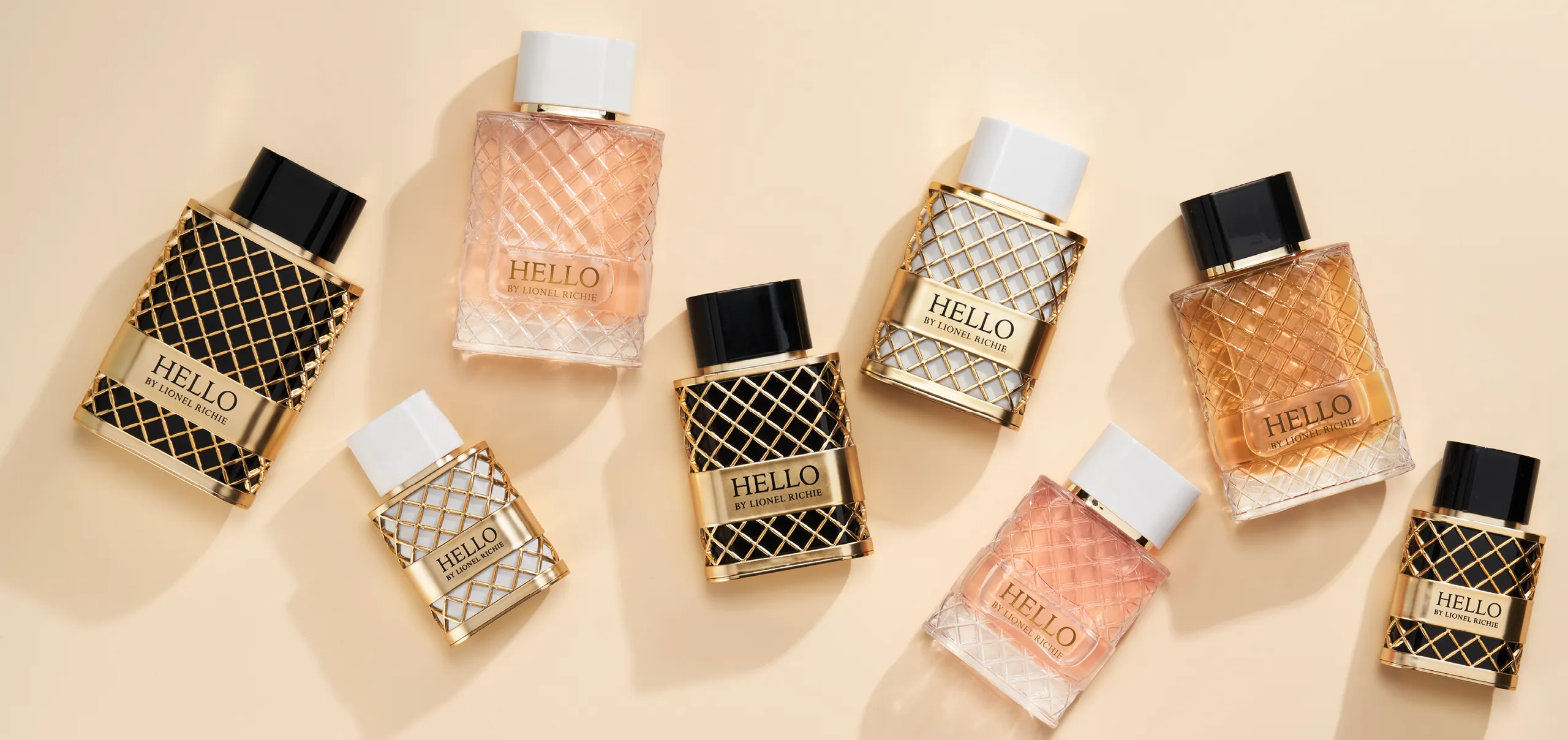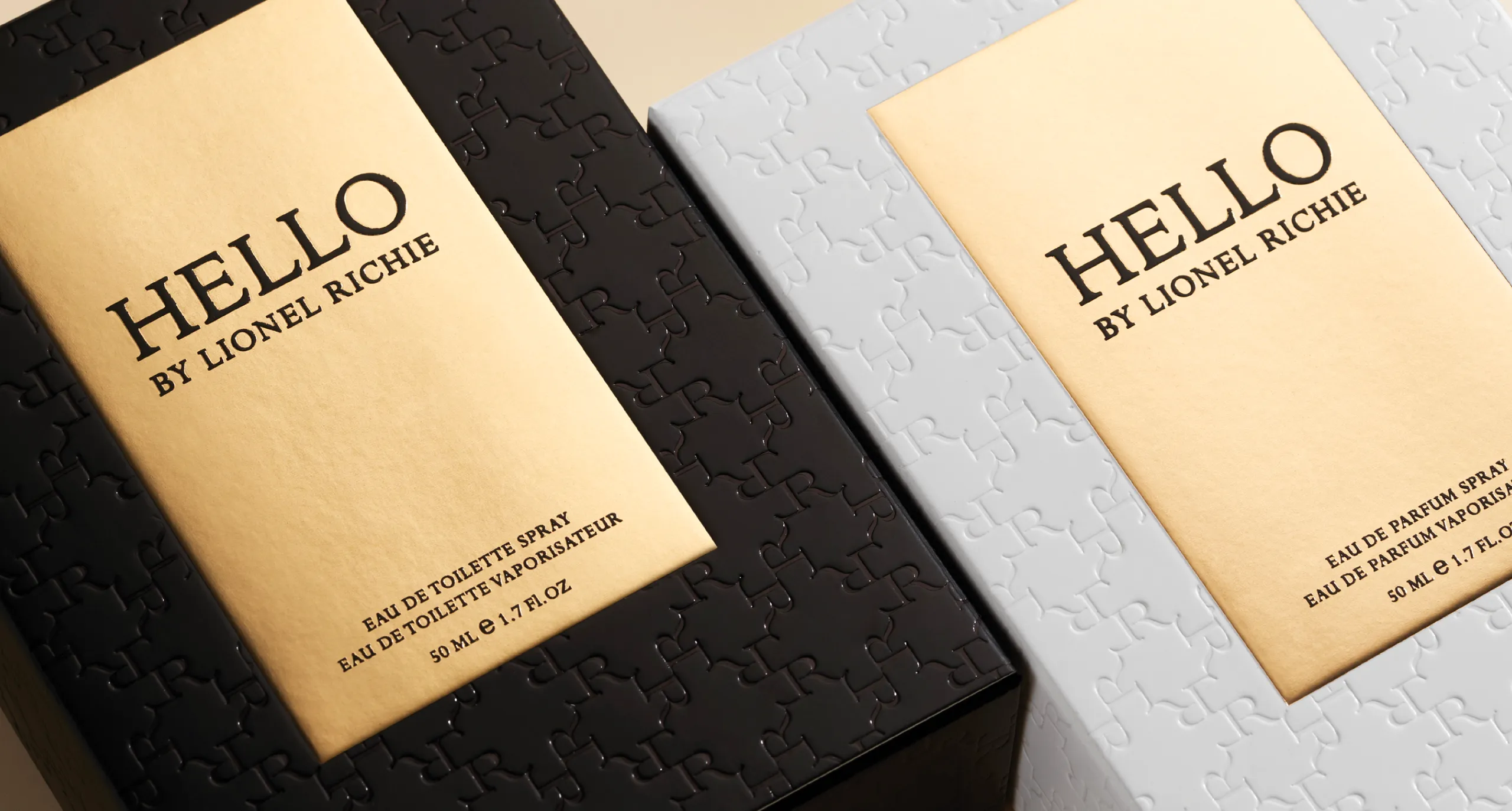 To reflect the theme, we created a unique gold cross hatch casing that envelops black glass for the men’s fragrance and white glass for the women’s. The soft square shape of the glass is a nod to the rich Italian architecture that resides both inside and outside. The top of the caps have his iconic logo debossed for a subtle and sophisticated accent. Appropriately named, “HELLO”, one of Lionel Richie’s iconic songs, Lionel’s entry into the category reflects his warm and inviting demeanor.